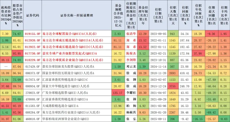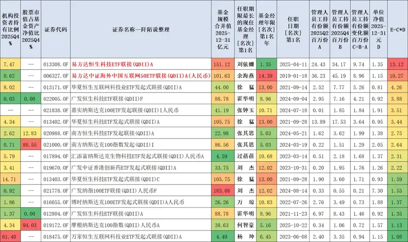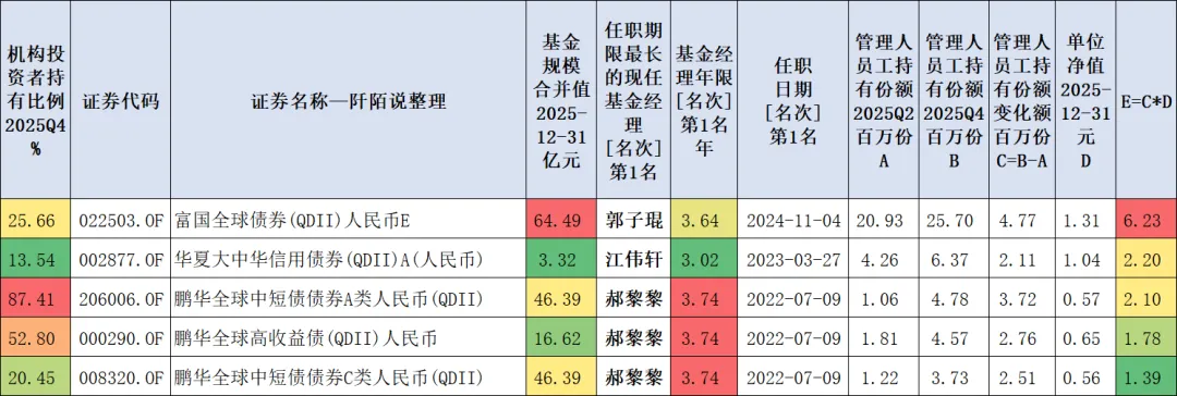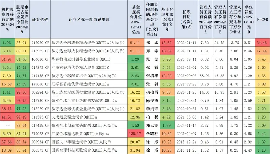 最近眼睛有点不舒服,写文章尽量简短些。 因为2025年基金年报刚刚披露,能拉出的数据都还算是比较新的。 要求基金是QDII基金,内部员工持有份额变化额(2025Q4与2025Q2的净额)与2025年12月31日的单位净值相乘,保留大于1.0的合计有37只——意味着它们是2025年下半年被内部员工加仓较多的QDII基金榜单,详见下表。 数据来源:妙想Choice,截至20260403,历史业绩不预示...