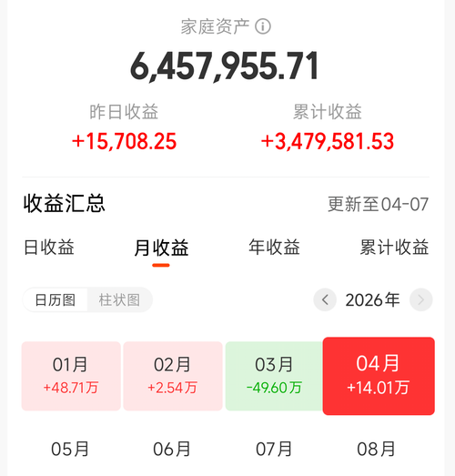 兄弟姐妹们,冒个泡!今天打开天天基金后台,看了一眼账户。家庭资产总额645万多,本金300万,累计收益347万多。但说实话,这一个多月,十拳剑灵心里也有点发毛。3月份,A股跌得太狠了。3月23日那天,全市场超5100只个股下跌,逾130只股票跌停。十拳剑灵的这个账户,3月份一个月亏掉了49万。昨天日收益才回血1.5万,到今天4月才回来14万左右。49万的坑,填了快半个月才填回来一小截。为啥3月份跌...