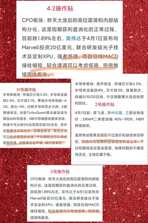 宝子们上午好呀!昨晚兜兜就复盘说了了:全球风险资产对地缘问题已经开始“脱敏”,那个一惊一乍的节点,翻篇了!震荡洗盘不可怕,是在给冲4000点偷偷蓄力,整体向上趋势不变!结果今天?啪——直接站上4000点!目前超4600家上涨,量也小小放出来了,又是一场普天同庆的普涨大派对!昨天普跌的时候,兜兜死磕的CPO和半导体设备,照样逆势吃上肉!资金抱团得明明白白,不枉兜兜天天念叨“可以低吸,拿稳了”——听...