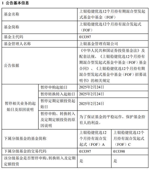 转公告内容:暂停申购等业务公告:1、自2025年2月24日起,本公司将暂停上银稳健优选12个月持有期混合型发起式基金中基金(FOF)$上银稳健优选12个月持有混合发起式(FOF)A(OTCFUND|013397)$$上银稳健优选12个月持有混合发起式(FOF)C(OTCFUND|013398)$(以下简称“本基金”)的申购、转换转入及定期定额投资业务。2、本基金的赎回、转换转出业务仍照常办理。3、...