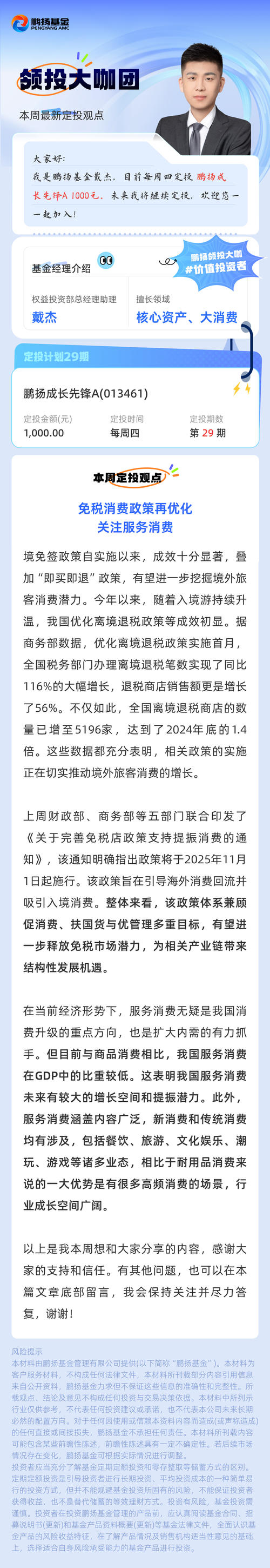 鹏扬基金戴杰:免税消费政策再优化,关注服务消费(定投计划29期)