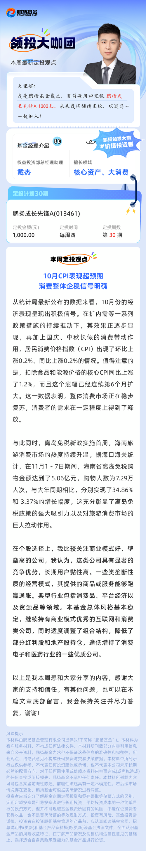 鹏扬基金戴杰:10月CPI表现超预期,消费整体企稳信号明确(定投计划30期)