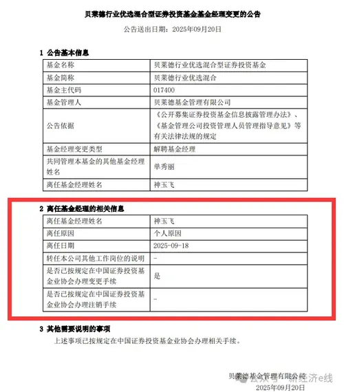 首家外商独资公募陷人才流失困局。 9月20日,贝莱德基金公告显示,旗下基金经理神玉飞因个人原因宣布离任,同时也将不在公司转任其他职位。 从个人履历来看,神玉飞曾任银河基金宏观策略研究员、行业研究员、基金经理助理以及基金经理等职务,并于2023年加入贝莱德基金。同年3月,神玉飞开始管理贝莱德行业优选,2024年1月开始管理贝莱德中国新视野。离任前,神玉飞还担任了贝莱德基金首席权益投资官一职。 来源:...