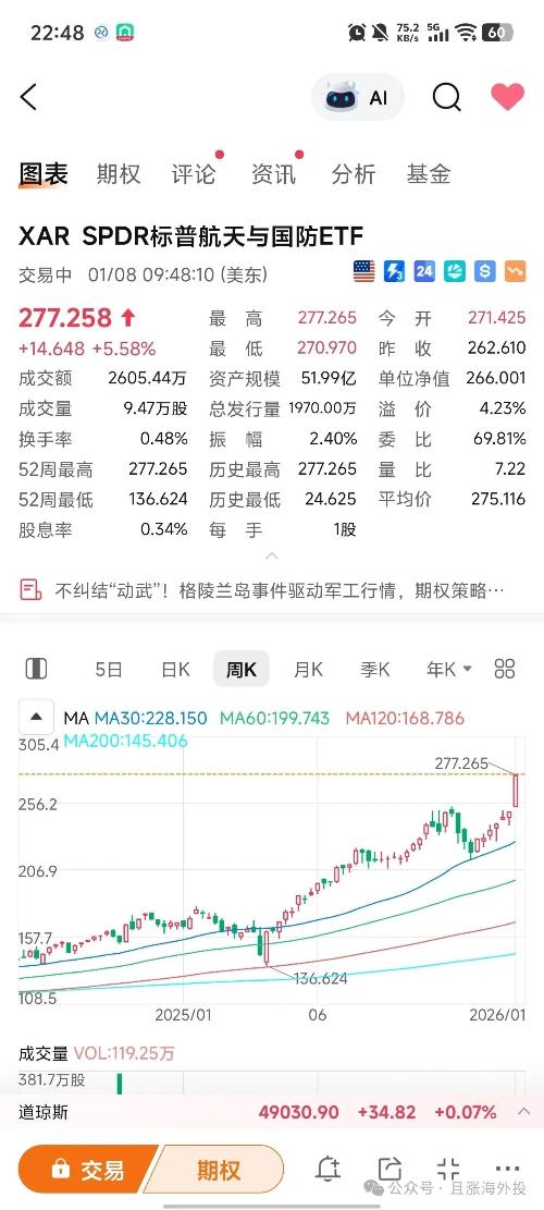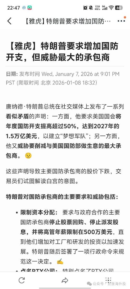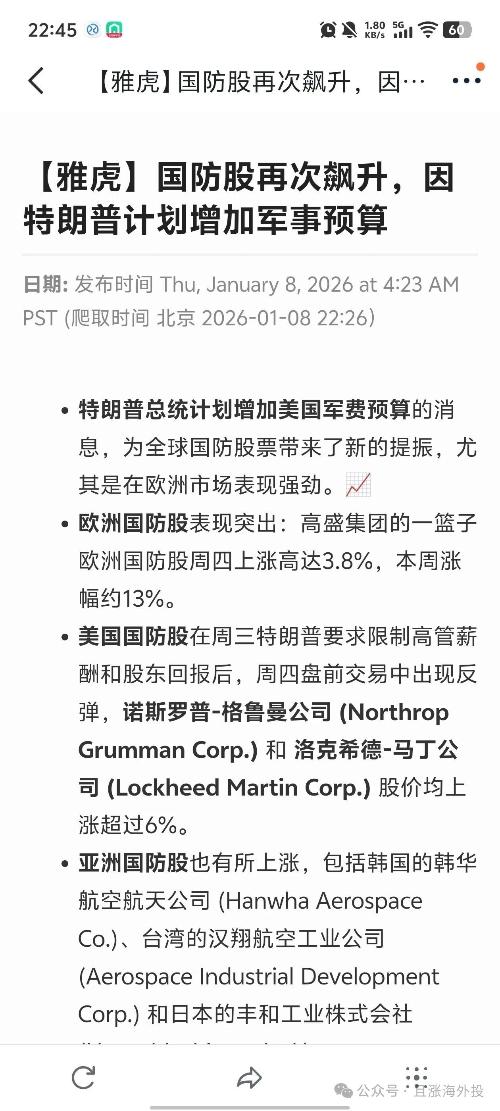 这两天国内的商业航天概念表现非常的火热,已经上涨到了让我看不懂的地步,不过美股那边的太空概念也表现非常火热,并且现在商业航天处于一种商用和军用同时兼备的这样一个特点,因此这两个板块基本上会互相催化。同时在传统的国防军工板块当中,近期海外方面也有催化。首先就是川普在拿下了委内瑞拉之后,最近又对格陵兰岛放出狠话,《特朗普为什么想要格陵兰岛?》,同时又希望今年美国的国防开支增长50%...