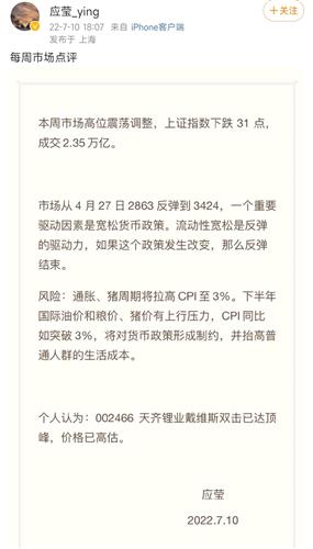 话说强势的天齐锂业今天跌停,7月10日,徐翔妻子应莹在微博发布《每周市场点评》提到了近期大热股天齐锂业。应莹BB:天齐锂业戴维斯双击已达顶峰,价格已高估。天齐跌停,嫁祸于一个小女子太牵强附会了!股价两个月涨到快3倍了,调整一波岂不正常?!新能源汽车产业链正在高速公路上,长期看,锂电锂矿只涨到半山腰而已。天齐跌停,真正的导火索是天齐港股发...71 -