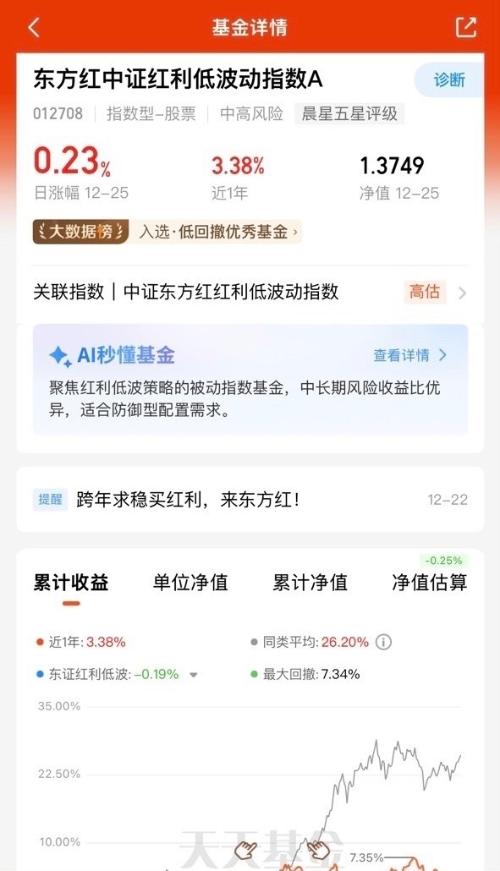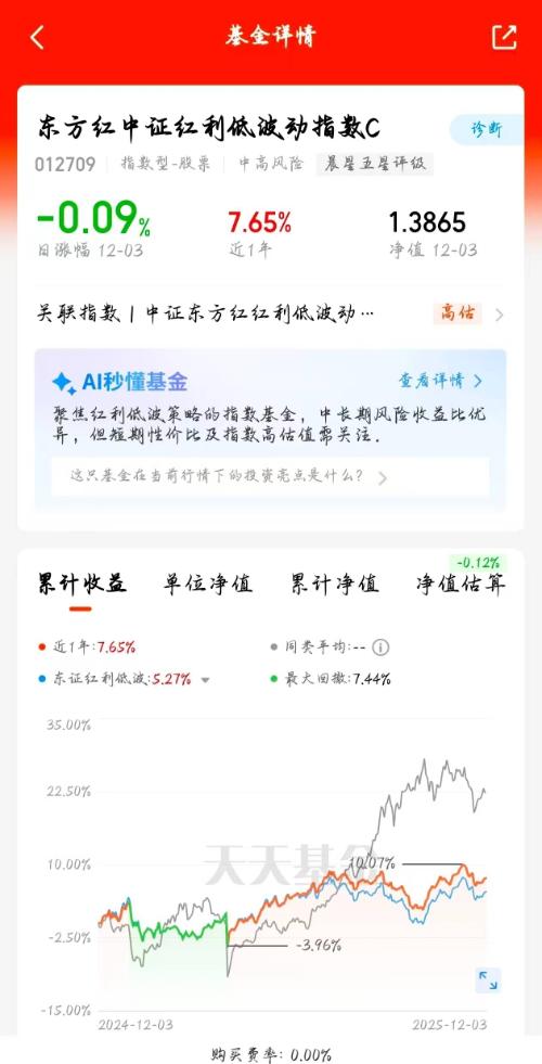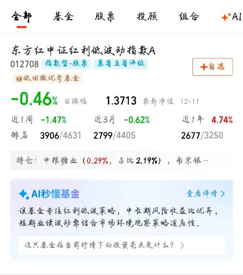 年底避险+降息双重利好,东方红中证红利低波动指数A太香了,近一年4.74%的收益实打实,成分股都是优质企业,低波动特性控回撤,现在布局正当时。