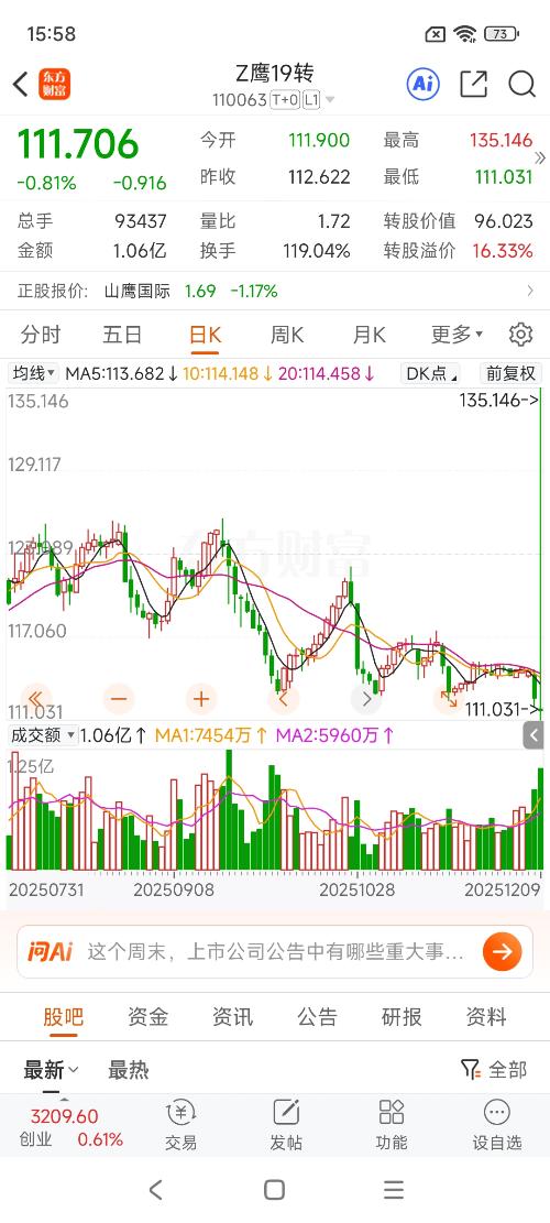 $Z鹰19转(SH110063)$转股值不到97,赎回111,扣税还不到110,尾盘接的有点伤,不过正股目前这个状态,拉15个点也不容易,吃一堑长一智吧