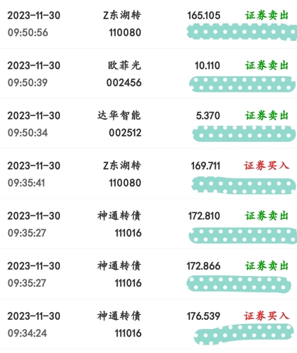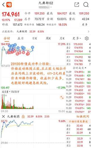 $九典转02(SZ123223)$$Z东湖转(SH110080)$$神通转债(SH111016)$今天大盘大概率调整,出掉正股,转战转债:感谢九典转债主力仁厚,上午靠九典转债不仅将开盘操作的东湖转债与神通转债的亏损追平,还将今日收益拉红了。下午一般行情不好,就不参与转债了。祝留下的朋友继续发财。