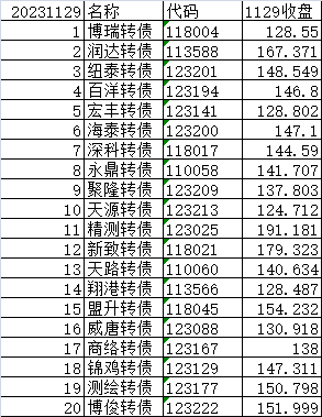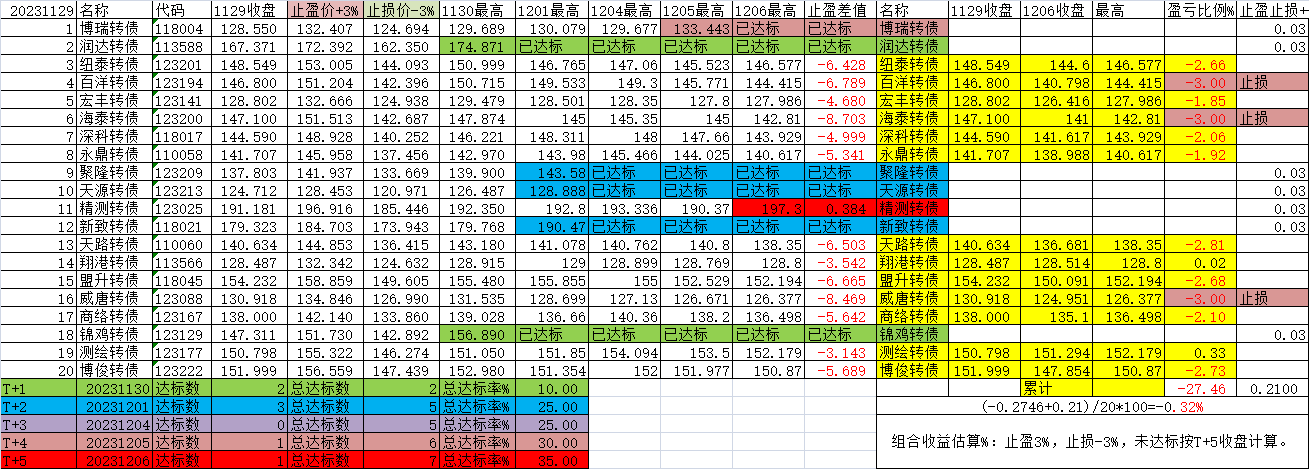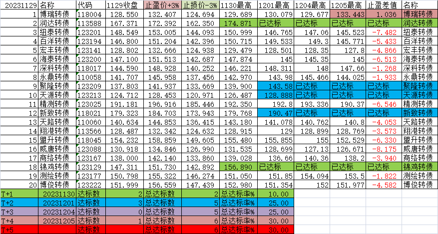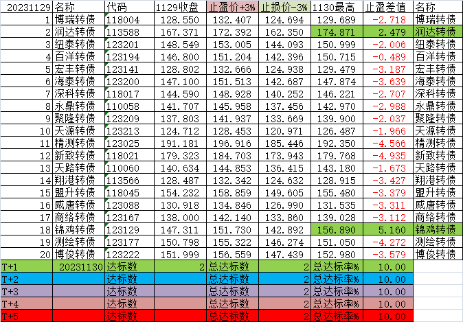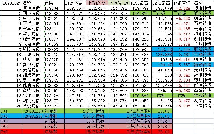 尾盘可转债选股(短线目标),即每日尾盘14:40后,通过选债公式,选择一批可转债标的,考察标的一周内大于3%收益的概率(五个交易日,以最高价计算)。盘中本栏目不便及时发帖。为了计算方便,盘后以当日收盘价作为计算初始数据。#凉凉?北证50大跌逾7%##外资借道指数产品布局A股##华为已向“四界”发出邀请#$特一转债(SZ128025)$$神通转债(SH111016)$$东湖转债(SH110080)$...