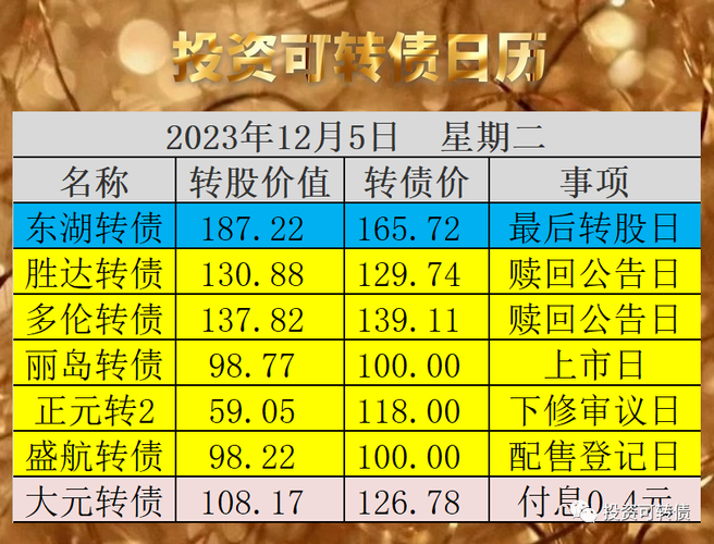 原文发送于昨日晚间。5日为东湖转债最后转股日,如果投资者忘记转股操作,将被100.65元赎回,亏损40%以上。胜达转债、多伦转债满足赎回条件,公司都宣布提前赎回,利空正股与转债。上周上市的金钟转债还没有停下脚步,5日又迎来超级肉签丽岛转债上市,可能比金钟转债更猛,详见后文。5日为正元转2下修审议日。大股东持有可转债,预计通过有点悬念。正股前20日均价为20.432元,前1个交易日均价为19.359...