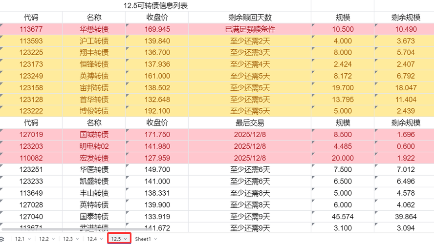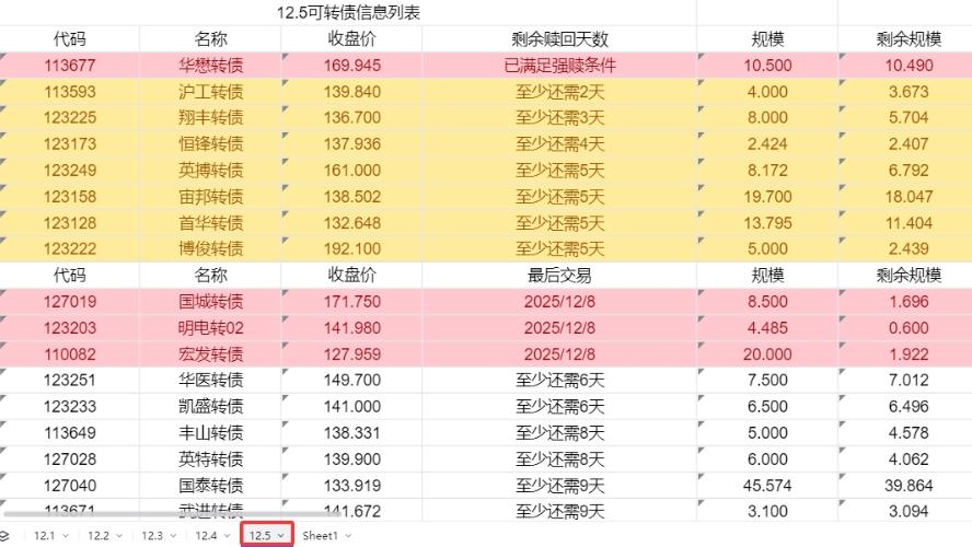 12.7号一只转债不赎回与三只转债最后交易 一、不赎回 【华懋转债:不赎回】华懋科技公告,虽已触发“华懋转债”的有条件赎回条款,但公司决定不行使提前赎回权利,且在未来三个月内(至2026年3月5日)即使再次触发条款亦不赎回。公司将在该期限结束后重新审议是否行使赎回权,并披露相关主体在赎回条件满足前的交易情况。$华懋转债(SH113677)$ 二、最后交易 【国城转债:最后交易】国城矿业公告提示,“...