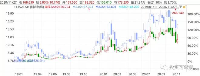 科森转债退市科森转债已经退市,其K线图见下。科森转债发行于2018.11.16,上市于2018.12.7,终止于2020.11.26。上市首日收盘价为97.95元,最低价为92.1元,最高价为268.14元,最后收盘价为168.63元,存续期为2.03年,期间收到利息1.2元。满额申购中3.29签,首日卖出盈利-67.42元,持有到期盈利2296.71元。首日买入持有到期收益率为73.38%,年化...