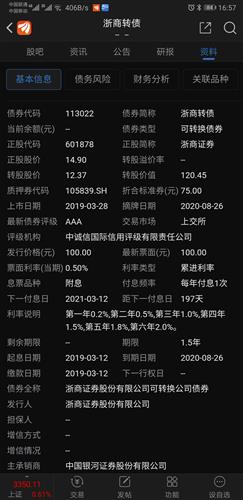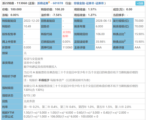 今日申购——浙22转债:债券代码:113060(浙商证券601878)信用评级:AAA转股价值:约108.2元正股质地:浙江国有企业(实控人为浙江省交投集团),2017年上交所上市,主营业务不再赘述,公司前两大业务是期货和经纪,分别占比64%、14%,公司行业排名在20名开外。这是公司第二次发行转债。首次发行叫浙商转债,2019年3月发行,2020年8月强赎,退市价118.46,存续期间最高价1...