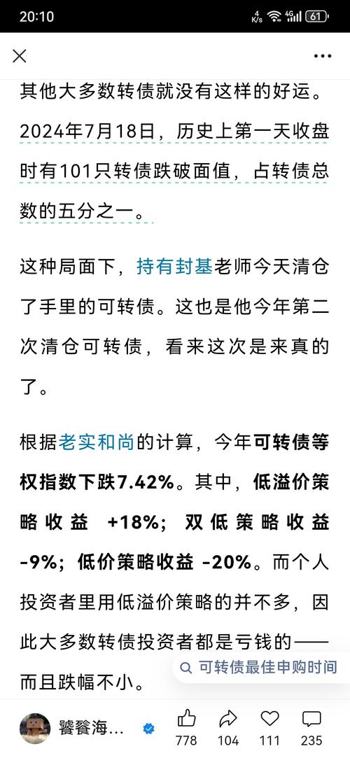 $兴业转债(SH113052)$兴业转债:转股开始了,现在大部分转债的筹码在120元上下成本。现在正股价18.9元左右,转股价20.63元,转一张债券亏28块多。没算错的话,正股起码要在24块多大家转股才会划算。大家觉得公司会愿意还钱还是愿意拉股价让大家转股?