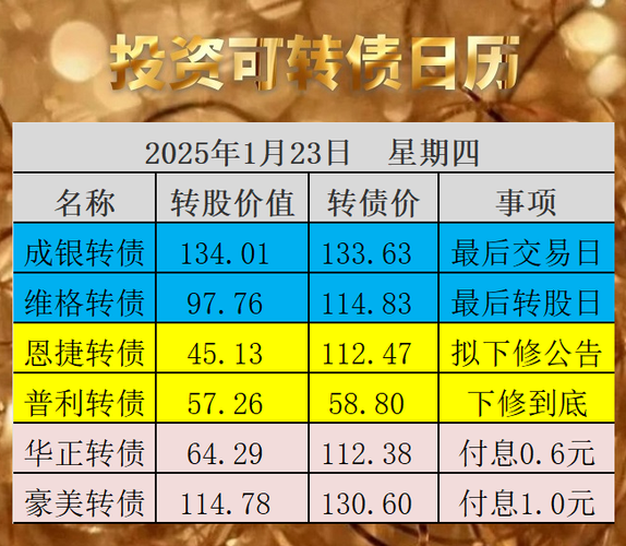 原文发送于昨日晚间。一枚中肉签上市日期定了23日为成银转债最后交易日,如果投资者忘记操作,还可以在2月5日最后转股日之前转股卖出。23日为维格转债最后转股日,当前转股价值低至98元,不如持有获得税前赎回价112元划算。恩捷转债满足下修条件,公司提出下修议案,利好转债,详见下修信息列表。普利转债下修议案获得通过。公司宣布转股价下修到4.89元,与昨天发文中预测一致,下修到底了。下修后,转股价值上升到...