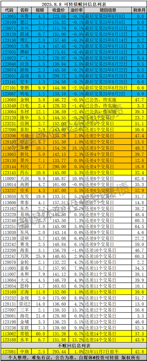原文发送于昨日晚间自媒体 豪鹏转债、东材转债满足赎回条件,公司宣布提前赎回(强赎),豪鹏转债最后交易日为8月25日,东材转债赎回实施待公告。当前溢价率分别为-2.5%、-2.4%,中幅折价,全部转股将分别新增约24%、12%流通股,有较大的赎回压力。 中旗转债满足赎回条件,公司宣布3个月内不赎回。 隆华转债、信测转债、泰坦转债还差一个交易日满足赎回条件,警惕8日盘后强赎的风险。 正海转债、常银转债...