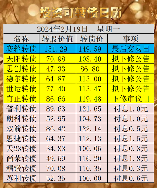 原文发送于昨日晚间。19日为赛轮转债最后交易日,如果投资者忘记操作,还可以在22日最后转股日之前转股卖出。天阳转债、思创转债、德尔转债、世运转债满足下修条件,公司提议下修,批量利好转债,详见下修信息列表。19日为奇正转债下修审议日。此前转股价已经下修过2次,预计通过无悬念。正股前20日均价为19.489元,前1个交易日均价为20.089元,下修有净资产限制,每股净资产为6.04元,下修到底的价格为...