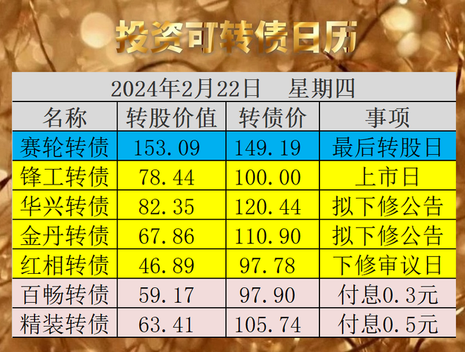 原文发送于昨日晚间。22日为赛轮转债最后转股日,如果投资者忘记转股操作,将被100.16元赎回,亏损30%以上。22日锋工转债上市,预计是大肉签一枚,详见后文。华兴转债、金丹转债满足下修条件,公司提议下修,利好转债,详见下修信息列表。22日为红相转债下修审议日。之前有超过下修经验,预计通过无悬念。正股前20日均价为3.692元,前1个交易日均价为3.339元,下修无净资产限制,下修到底的价格为3....