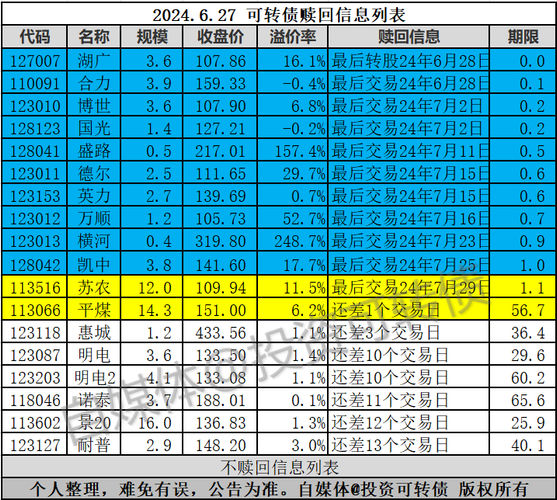 原文发送于昨日晚间。苏农转债即将到期,公司宣布到期赎回。最后交易日为7月29日,最后转股日为8月1日,赎回价为110元。平煤转债还差1个交易日满足赎回条件,警惕26日盘后强赎的风险。注:赎回影响参见专栏《什么是可转债最大的风险?》。本文观点和原理参见《价值可转债投资策略》(作者:宁远君,唐斌)。《暴涨!暴涨!》《下修不停息》《一批转债评级下调》《2只转债提议下修,3只转债即将满足》已同步发文,欢迎...