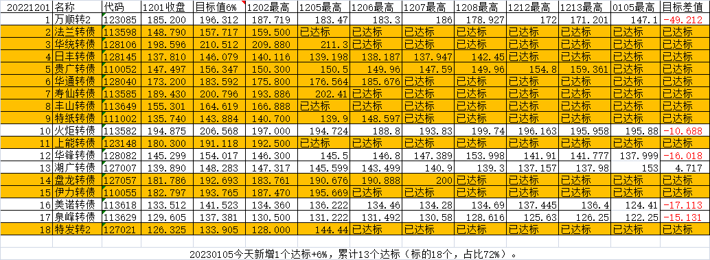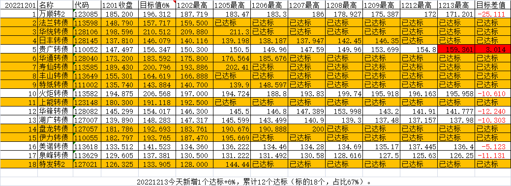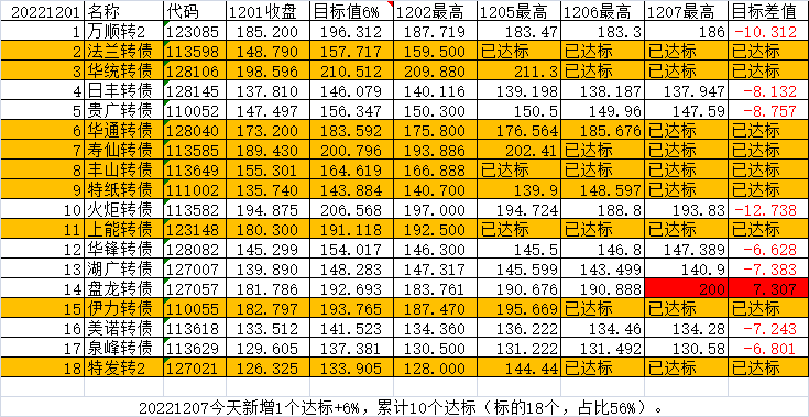 每日尾盘可转债选股(短线目标),即每日尾盘10分钟左右,或者盘后选择一批可转债标的,博取一个月内(力争一周内)获得不低于6%的收益(以最高价计算)。为了计算方便,以收盘价作为计算初始数据,成功与否以后续最高价-0.001为参考。仅供研究参考,以此投资风险自负!$台华转债(SH113525)$$金诚转债(SH113615)$$特一转债(SZ128025)$