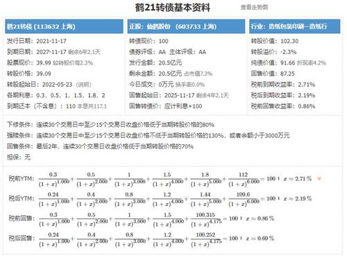 鹤21转债,申购代码754733,交易代码113632。整体评价:类黄金级,转股价值102.30元,按当前情况预计每签可以盈利190元。基本信息:AA,6年期,转股折价率2.3%,每张持有到期本息为117.1元(税后本息为113.68元)。发行规模20.5亿元,每股配售2.903元,最低345股即可配售一签,股权登记日为11月16日。正股仙鹤股份(603733),公司主营业务为研发、生产和销售高性...