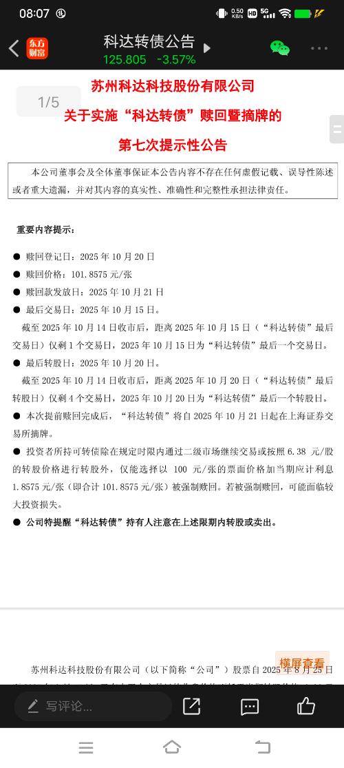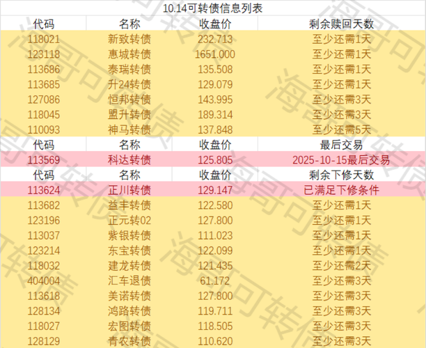 两只转债最新触发赎回与下修 一、最后交易 【科达转债:最后交易】苏州科达决定提前赎回“科达转债”,赎回登记日为2025年10月20日,赎回价格为101.8575元/张,赎回款将于10月21日发放。可转债的最后交易日为10月15日,最后转股日为10月20日,赎回完成后债券将于10月21日摘牌。公司提醒投资者及时转股或卖出,避免因强制赎回造成投资损失。$科达转债(SH113569)$ 二、下修 【正川...