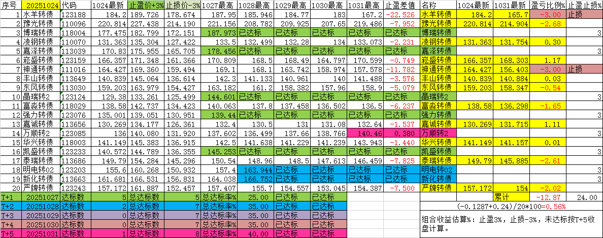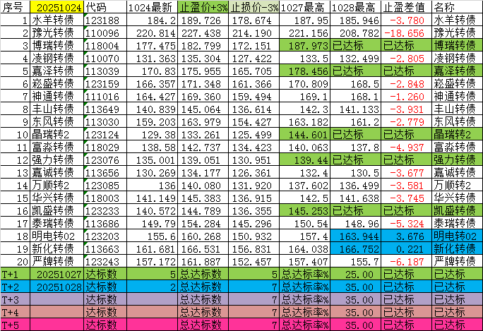 尾盘可转债(短线),每日尾盘14:40后,通过选债公式自动选择一批可转债标的,一周内大于3%收益的概率(五个交易日,以最高价计算)。盘中采用其他方式公布,本平台栏目不便及时发帖。为了计算方便,盘后以当日收盘价作为计算初始数据。 #存储芯片价格持续攀升!如何掘金产业链?##林园:4300点是A股牛市的起点 ##特斯拉Optimus 3代或明年一季度发布#...