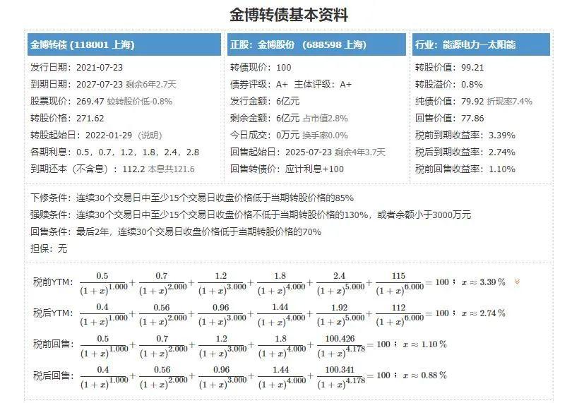 金博转债,申购代码718598,交易代码118001。整体评价:类黄金级,转股价值99.21元,按当前情况预计每签可以盈利200元。基本信息:A+,6年期,转股溢价率0.8%,每张持有到期本息为121.6元(税后本息为117.28元)。发行规模6亿元,每股配售7.498元,最低134股确保可配售一签,股权登记日为7月22日。正股金博股份(688598),科创板,光伏概念,新材料概念,从事先进碳基复...