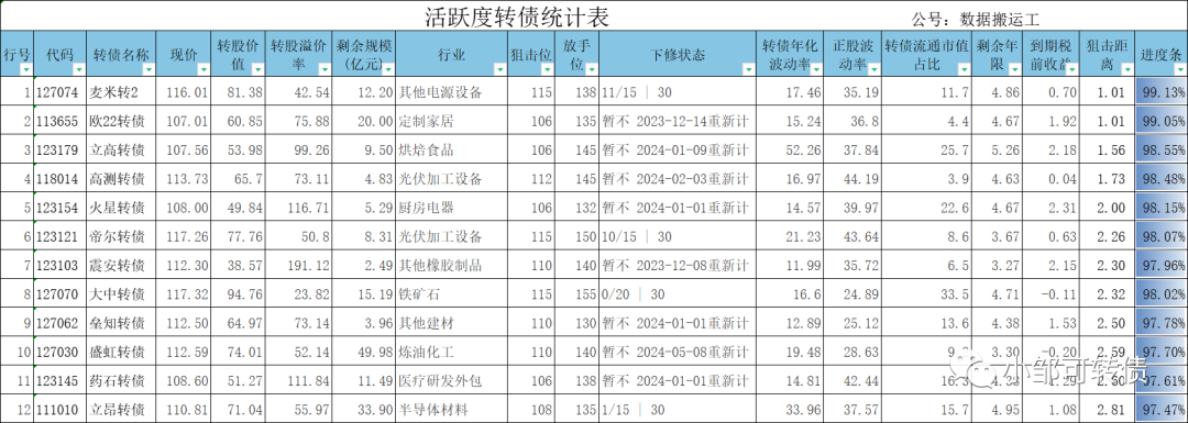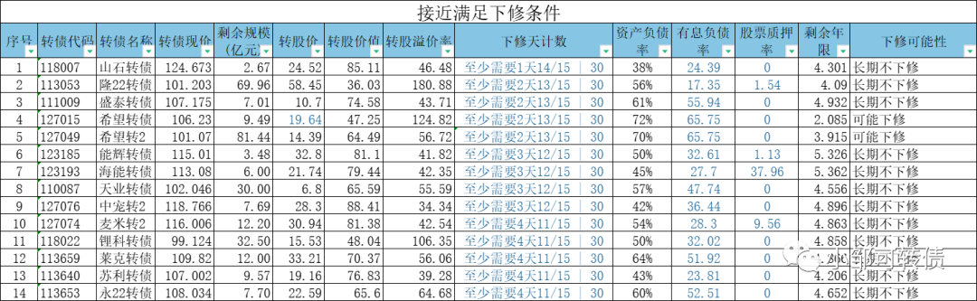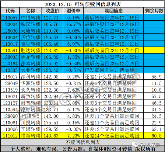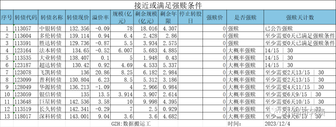 原文发送于昨日晚间。胜达转债宣布实施赎回。最后交易日为12月21日,最后转股日为12月26日,赎回价为100.74元,只剩下5个交易日了,投资者需要警惕。深科转债还差1个交易日满足赎回条件,注意提防15日盘后强赎的风险。福新转债正股高于赎回条件价,加入赎回列表,还差14个交易日满足赎回条件。注:赎回影响参见专栏《什么是可转债最大的风险?》。本文观点和原理参见《价值可转债投资策略》(作者:宁远君,唐...