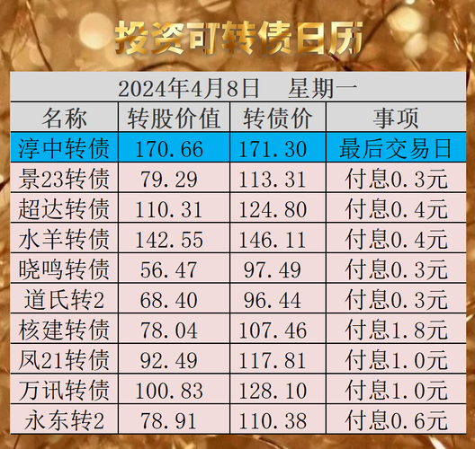原文发送于昨日晚间。8日为淳中转债最后交易日,如果投资者忘记操作,还可以在11日最后转股日之前转股卖出。景23转债、超达转债、水羊转债、晓鸣转债、道氏转2、核建转债、凤21转债、万讯转债、永东转2等9只转债将发放利息,投资者注意查收;同时网格交易将中断,注意重新设置网格。本文观点和原理参见《价值可转债投资策略》(作者:宁远君,唐斌)。《资源为王》《5000亿撬动5万亿》《资源类可转债列表》《3只转...