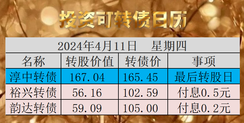 赎回登记日:2024.04.11赎回提醒:根据安排,截至2024年4月11日收市后仍未转股的“淳中转债113594”,将按照101.312元/张被强制赎回,4月8日为“淳中转债”最后一个交易日,特提醒“淳中转债”持有人注意在限期内转股或卖出,如投资者未能在期限内转股,被强制赎回,可能面临较大投资损失,敬请广大投资者详细了解可转债的相关规定,注意投资风险。赎回登记日:2024.04.12赎回提醒:根...