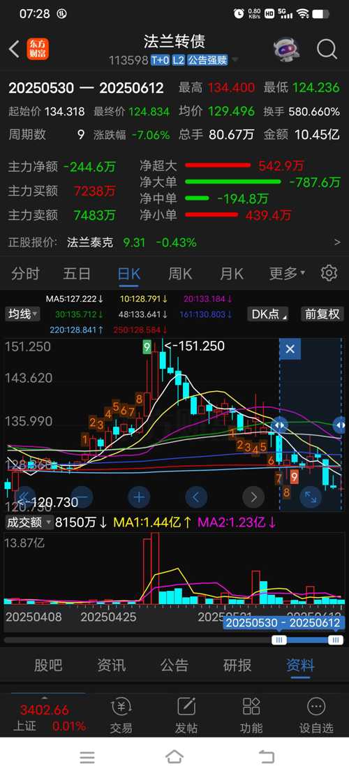 6月13日上证指数低开低走,收盘3377点,下跌27点,全市场成交15039亿元,849只股票上涨,4477只下跌;63只股票涨停,15只跌停。转债市场成交623亿元,58只转债上涨,413只下跌。 周五市场因以色列袭击伊朗,中东局势不稳,引发资金卖出避险,市场大跌,只有黄金、石油、军工、核防治等少数板块上涨。从周末的战况看,伊朗明显不是以色列对手,国土被以色列战机狂轰滥炸,军事设施遭到严重损毁,...