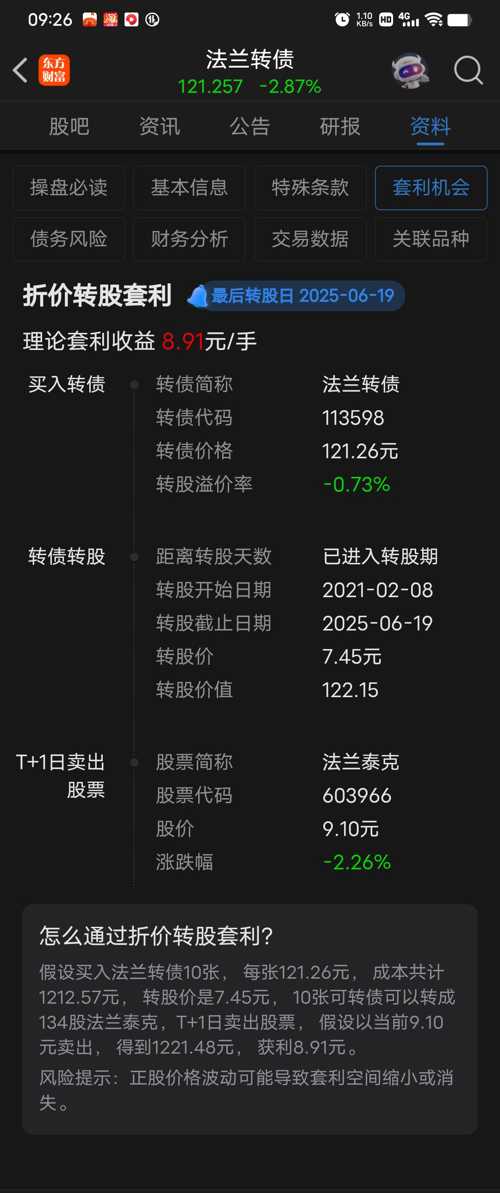 $法兰转债(SH113598)$ 【6-16最后交易日——剩余1日】 最大转股数700.1275万股 市值 9.1*700.1275=6371.16万元 转债市值 121.257*52.1595=6324.7万元 9.1*1.1=10.01 9.1*0.9=8.19 9.1*13.42281879=122.147 10.01*13.42281879=134.36 8.19*13.42281879=...