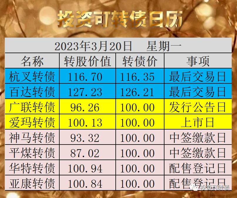 春23转债中签率公告显示,股东配售率约为76%,网上申购户数约为1030万户,中一签的概率为1.3%,即平均75个账户中一签,很难中签。20日收盘摇中签尾号,本号网友可以实施“留言中签发大财”策略。20日为杭叉转债、百达转债为最后交易日,如果错过,还可以在3月23日之前转股卖出,否则将分别被100.40元、100.05元赎回。广联转债宣布发行。预测满额申购中一签概率为:0.6%~1.9%,约79户...