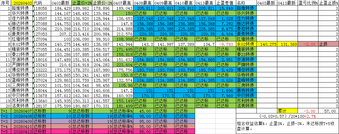 尾盘可转债(短线),每日尾盘14:40后,通过选债公式自动选择一批可转债标的,一周内大于3%收益的概率(五个交易日,以最高价计算)。盘中采用其他方式公布,本平台栏目不便及时发帖。为了计算方便,盘后以当日收盘价作为计算初始数据。 #社区牛人计划##存储巨头Q2或大幅提价!如何布局相关A股?##黄金站上4700美元!新一轮涨势开启?# $苏利转债(SH113640)$...