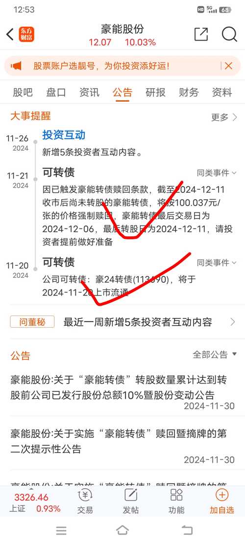 豪能股份先后发行了两只可转债,其中的一只是豪能转债,它符合了发行合约中强制赎回的条件,公司的资金也比较宽裕,决定以100.037元的价格买回二级市场剩余的豪能转债的流通份额,目前该剩余流通份额估计不足1亿元,大部分已经以8.39元/股的价格转成了公司的股票。举例讲,你有10张豪能转债,账面价值1000元,强制赎回价格1000.37元,可以以8.39元的价格转成公司股票约119股(1000/8.39...