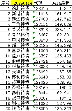 尾盘可转债(短线),每日尾盘14:40后,通过选债公式自动选择一批可转债标的,一周内大于3%收益的概率(五个交易日,以最高价计算)。盘中采用其他方式公布,本平台栏目不便及时发帖。为了计算方便,盘后以当日收盘价作为计算初始数据。 #社区牛人计划##美伊新一轮谈判或将很快开始##锂电产业链股活跃!核心逻辑是什么?# $盈峰转债(SZ127024)$...