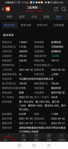 $Z金博转(SH118001)$今天尾盘挂卖Z金博转108.779无果,9月20日是赎回最后交易日,不知将出现什么亏损状?转科创板股没权限,只能等待该公司赎回。若按2图~划红线的价115续回,没理解错的话,还可略赚。就此不耻下问,请各路大神指教。2022.9.20.周二盘后。