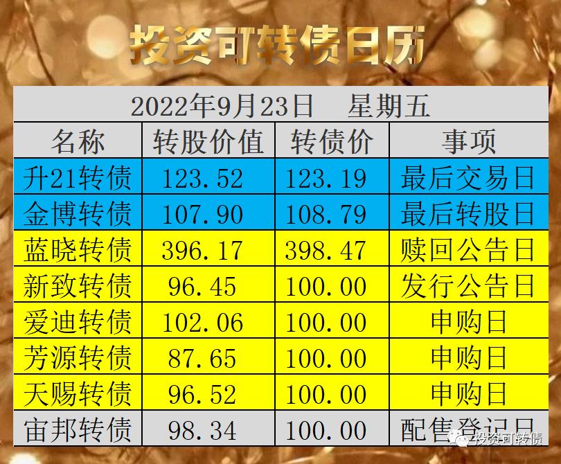 23日为升21转债最后交易日,忘记操作的投资者,可以在28日最后转股日之前转股卖出。23日为金博转债最后转股日,如果投资者不做转股操作,将被100.12元赎回,小亏7%左右,这是金博转债最后的退出机会。高价蓝晓转债突然宣布赎回,有一定的赎回压力,博弈不赎回的投资者失望了。详见赎回信息列表。软件服务行业发行5亿小盘新致转债。预测满额申购中一签概率为:0.4%~1.2%,含权比例接近20%高含权,抢权...