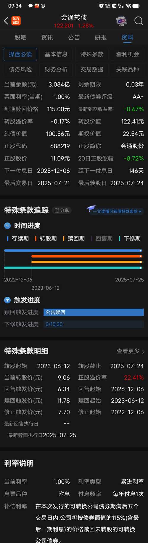 $会通转债(SH118028)$ 【公告强赎风险】 2025.7.21——【最后交易日】6天 123.2-119.71=3.49【套利空间】 3.49/119.71=0.029【2.9%】 3.49/11.037527594=0.316元 122.201/11.037527594=11.07 123.2/11.037527594=11.16 119.71/11.037527594=10.85 11...
