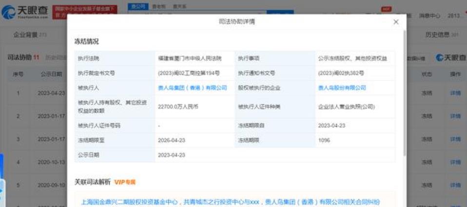 【贵人鸟2.27亿股权被冻结】近日,贵人鸟股份有限公司新增股权冻结信息,被执行人为贵人鸟集团(香港)有限公司,冻结股权数额为2.27亿,关联案件为合同纠纷,冻结期限自2023年4月23日至2026年4月23日,执行法院为福建省厦门市中级人民法院。(天眼查App)