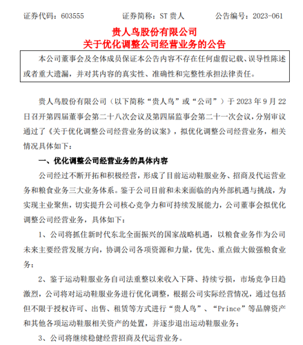贵人鸟已在2023年将大额亏损的鞋服业务剥离