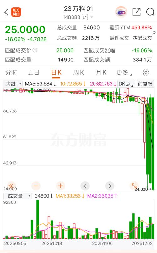 惊了!万科债券价格比恒大违约债还低,这是“抄底大礼包”? 12月2日,房企债市炸出个让人瞪大眼睛的场面——万科还在正常交易的存续债券,价格居然比早已违约的恒大债更便宜了。 打开行情软件,“21万科02”单日暴跌25%,最终收在26元;“23万科01”也跌了16%,收于25元。而另一边,早就实质违约、停盘许久的“15恒大03”,当前停盘价还稳在27元。 一个是仍在正常经营、没违约的头部房企债券,一个...