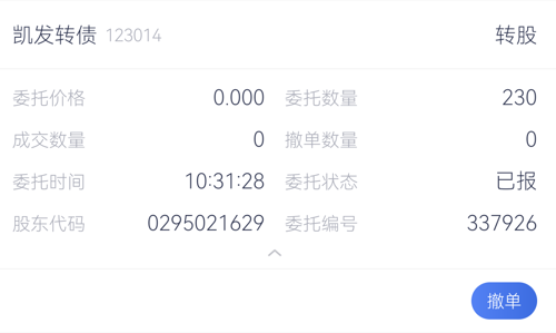$凯发转债(SZ123014)$请问有懂的吗我早上点了转股一直到现在都这样的是正常的吗