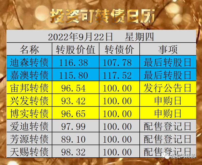 《大肉签上市,但一只妖债不下修前景堪忧》中,预测嵘泰转债上市首日收盘价在133~137元之间,溢价率约为38%。实际收盘为126.278元,溢价率为30.16%,均低于预期。中1签的投资者盈利262.78元。22日为迪森转债、嘉澳转债最后转股日,如果投资者不做转股操作,将分别被100.77元、101.56元赎回,小亏13%左右。锂电池电解液行业再发20亿宙邦转债。预测满额申购中一签概率为:1.6%...