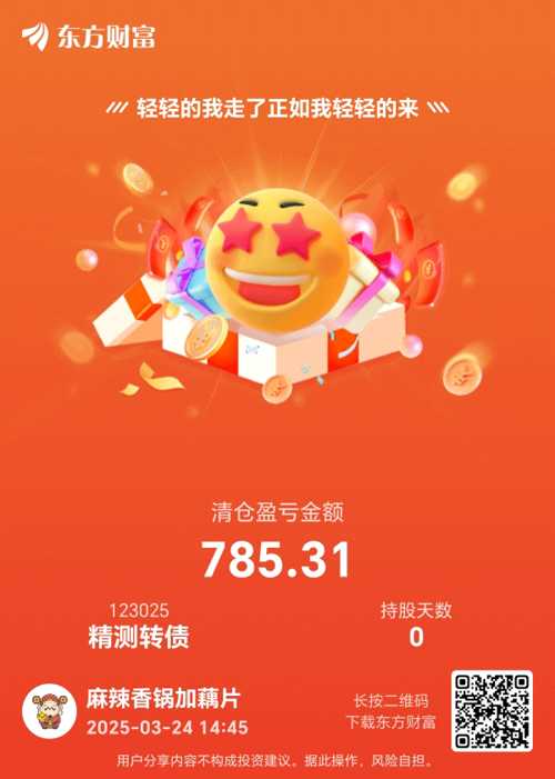 $精测转债(SZ123025)$上上次亏828,上次转400,这次700多回个本,谢谢主力,明天最后一天,祝大家继续发财,先撤了