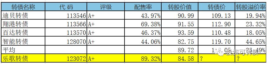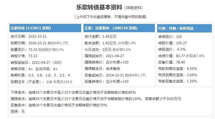 乐歌转债上市乐歌转债123072,乐歌股份300729,规模:1.42亿,2020-11-10上市转股价格73.13元,当前价格61.85元,转股价值84.58,评级:A+主营业务:人体工学家具产品的研发、生产及销售。概念:智能家居、跨境电商*行业较好,股价走势强,转股价值低***转股价值84.6元,假设溢价率25~30%,转债合理价格110~115元乐歌股份300729...