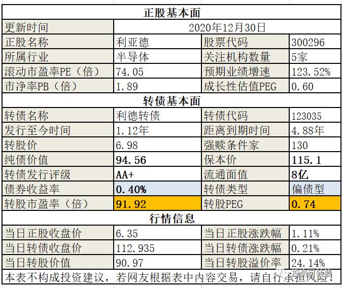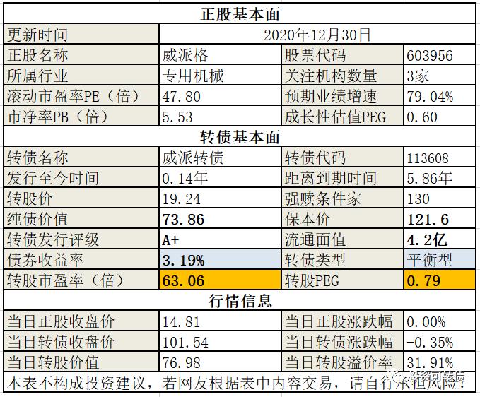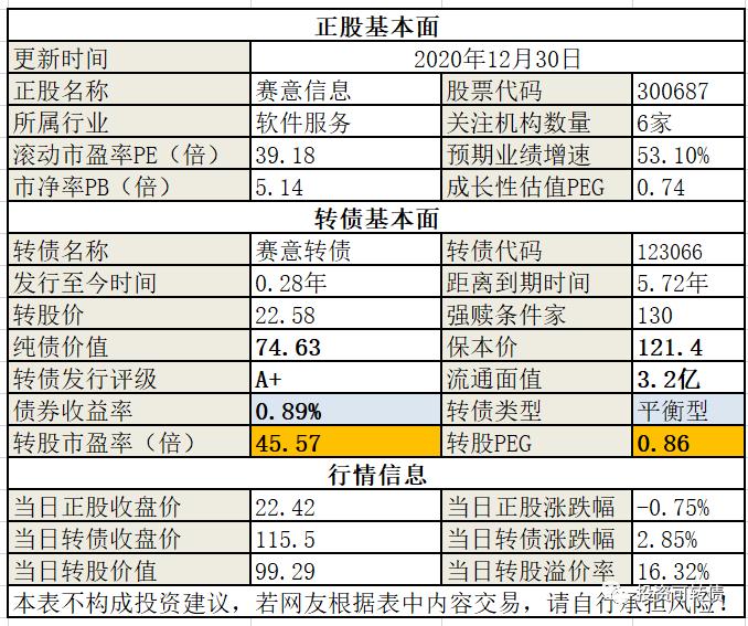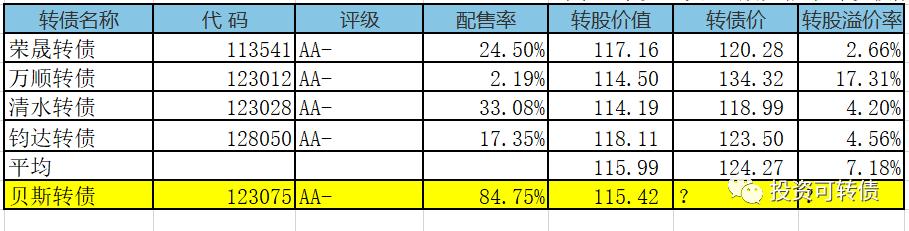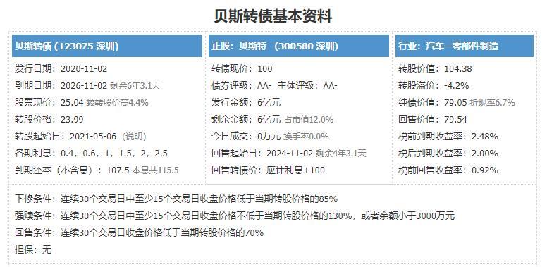 11月2日,贝斯特公开发行6亿元可转换公司债券,简称为“贝斯转债”,债券代码为“123075"。当前正股价:25.04元,转股价:23.99元,转股价值:104.38元,纯债价值:77.86元,保本价:115.5元,债券年收益:2.48%,AA-级。发行条款利息和赎回价:第一年0.40%、第二年0.60%、第三年1.00%、第四年1.50%、第五年2.00%、第六年2.50%。赎回价:110元。强...