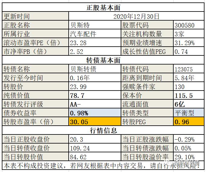 点击我的头像,可以查看和购买我的组合哦!贝斯转债,申购代码370580,交易代码123075。整体评价:黄金级,内在价值118.3元,按当前情况预计每签可以盈利170元。基本信息:AA-,6年期,转股折价4.19%,每张持有到期本息为115.5元(税后本息为112.4元)。发行规模6亿元,每股配售3元,最低34股可确保中一张,股权登记日为10月30日。正股贝斯特(300580),汽车零配...