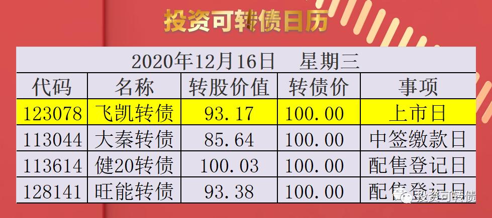 12月16日,飞凯转债上市,当前正股价:18.02元,转股价:19.34元,转股价值:93.17元,纯债价值:87.79元,保本价:115.2元,债券年收益:2.45%,AA级。发行规模为8.25亿。公司简介上海飞凯光电材料股份有限公司(股票代码:300398,飞凯材料)致力于为高科技制造提供优质材料,并努力实现新材料的自主可控。自2002年成立以来,飞凯材料始终专注于材料行业的创新与突破。从光通...